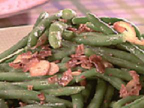 While green beans are cooking; in a large pan, heat the butter, oil, sliced garlic, and chopped bacon gently over medium heat. NOTE: Be sure not to let the garlic burn – a light golden brown is as dark as garlic should get.